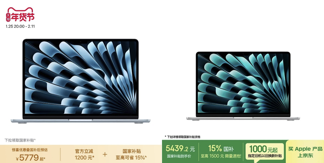 札记本电脑方面,配备M4芯片的13英寸MacBook Air在京东Apple居品年货节可享15%国补,得手价为5439.2元;天猫则为官方立减1200元后重复国补,得手价为5779元,两者差价近340元。